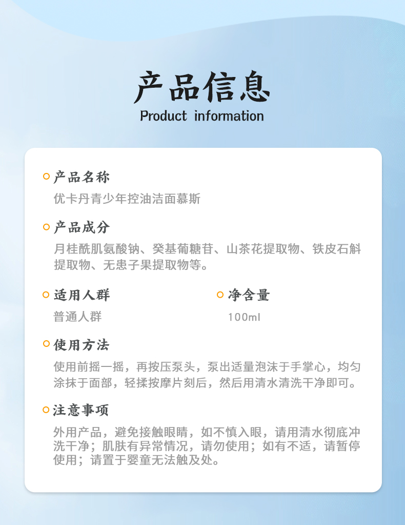 產品名稱:優卡丹青少年控油潔面慕斯
